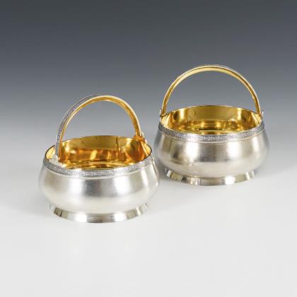 Floral und figural reliefiert. Dosen innen vergoldet, mit Scharnierdeckel und Daumengriff. Punzen: Feingehalt, zwei Fabrikmarken, einmal Halbmond und Krone