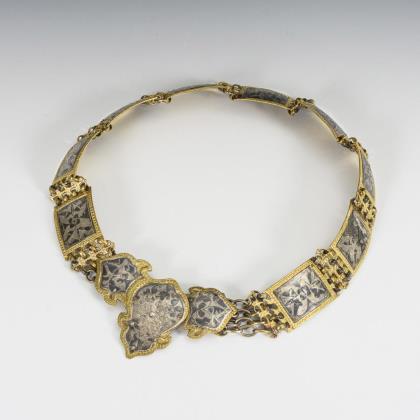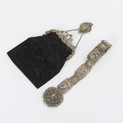 Schwarzes Täschchen mit reliefiertem Silberbügel. Gliedergürtel mit griechisch-mythologischen Szenen und indischer Göttin auf den Zwischenstücken. In originaler Schatulle des Hofjuweliers H. Bückmann