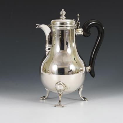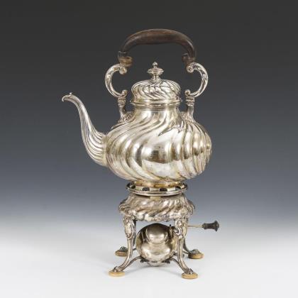 Godronierte Teekanne mit Scharnierdeckel. Auf geschweiftem Stövchen mit Brenner. Schauseitige Wappengravur (wohl Familie Straka von Hohenwald)