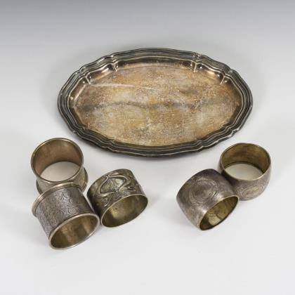 Ovales Tablett mit Profilrand, 2 Serviettenring-Paare und 1 Jugendstil-Serviettenring, datiert "(19)06". Mit Monogramm bzw. Namensgravuren