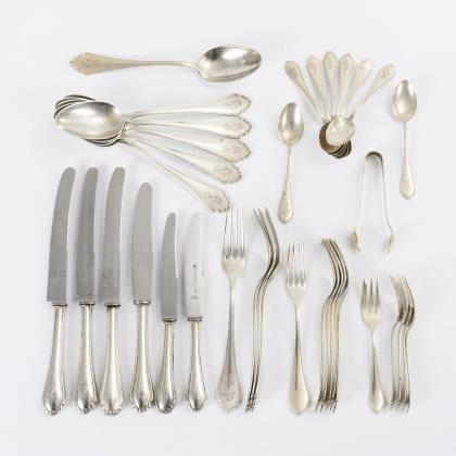 36-teiliges Speisebesteck mit 7-passigem Griffende und Monogrammgravur "ES": 6 Suppenlöffel, 4 Speisegabeln, 4 Menümesser, 6 Dessertgabeln, 2 Dessertmesser, 8 Kaffeelöffel, 5 Kuchengabeln und 1 versilberte Zuckerzange