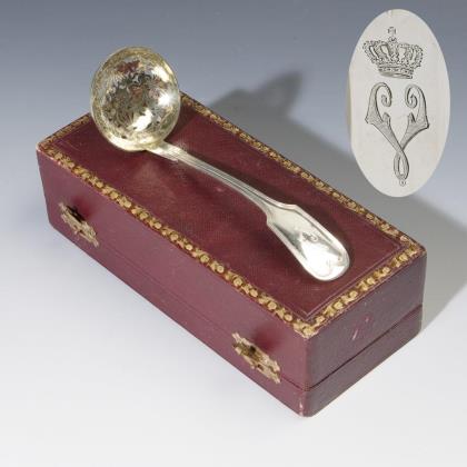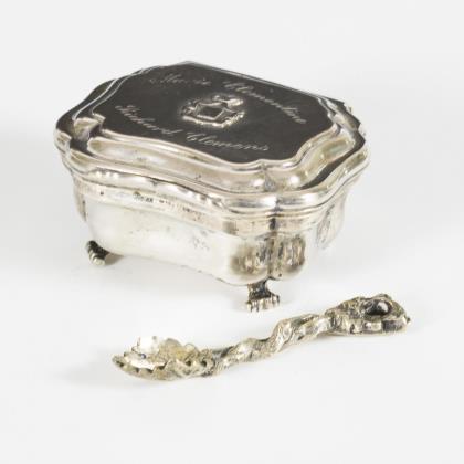 Kleines Deckeldöschen mit aufgelegtem Wappenschild und Gravur "Marie Clemetine Richard Clemens". Unterseitig: "F. H. G. HB". Innen vergoldet, mit Zwischensteg. Dazu kleiner Relieflöffel