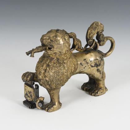 Vergoldetes Buckelschälchen mit reliefierten Handhaben (Ø 6 cm, 15 g). Schere in Storchenform, auf Krallenfuß