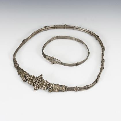 Langer Kordelgürtel und kurzes Kropfband mit "OM"-Zeichen an der Schließe. Beide Schließen mit Linksgewinde