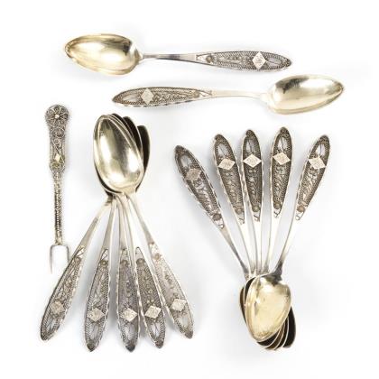 12 Silberfiligran-Löffel + Gäbelchen in Schatulle