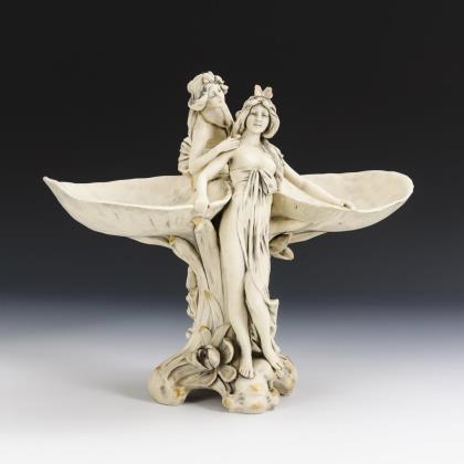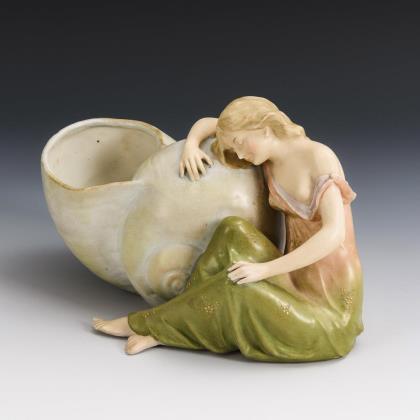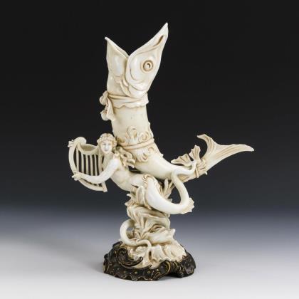 In Form eines Füllhorn in Fischgestalt gearbeitete Vase, auf einer Tritonin mit Harfe ruhend
