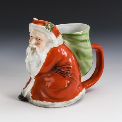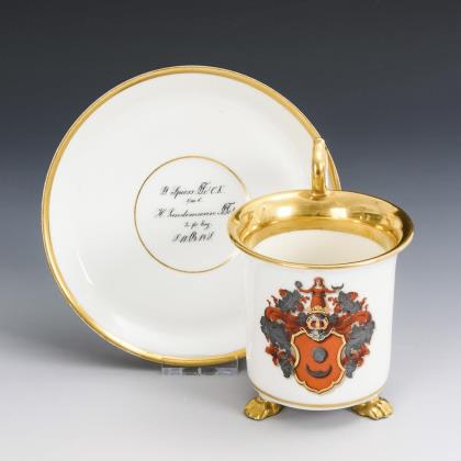 Zylindertasse mit Kraterrand, drei Tatzenfüßen und Rosettenhenkel. Schauseitig ein Wappen mit silbernem Totenkopf und Mondsichel auf rotem Schild. Im Spiegel der Untertasse die Widmung "G. Spiess (...) C. K. s/m l. H. Lindemann (...)! Zr. fr. Erg. (...)18(...)84S."