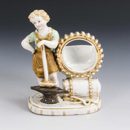 An einem Gehäuse als Uhrenhalter stehender Knabe als Schmied mit Lederschürze, Hammer und Amboss