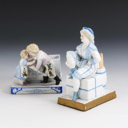 1x Kinderpaar vor 2 Zündholzbehältern mit Reibefläche. / 1x auf einem verschnürten Paket vor einem Fass als Zündholzbehälter sitzende Matrosendame