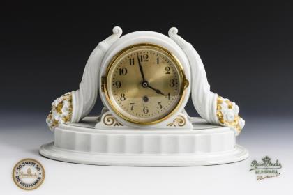 Auf ovalem Sockel ruhende, von zwei Füllhörnern flankierte Uhr. Uhrwerk batteriebetrieben