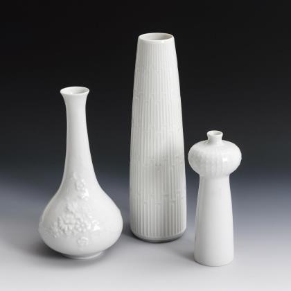 Schlanke und bauchige Balustervase, 1x mit der Darstellung einer Küstenlandschaft und 1x mit der Darstellung eines Heckenrosenzweiges mit Schmetterling