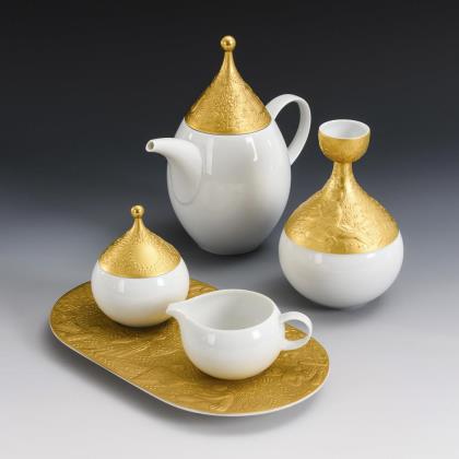 5 Teile. Reich reliefiertes, teils goldbronziertes Porzellan mit Szenen aus der Zauberflöte von W. A. Mozart. Kaffeekännchen (H 18,5 cm), Tablett (L 24,5 cm) mit Milchkännchen und Zuckerdose sowie Vase (H 14,4 cm)