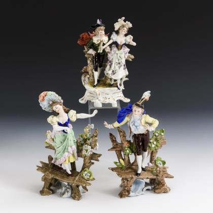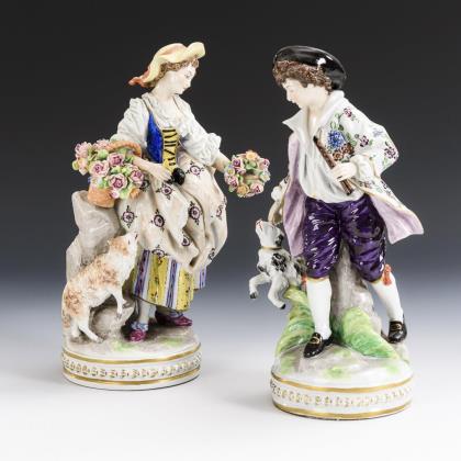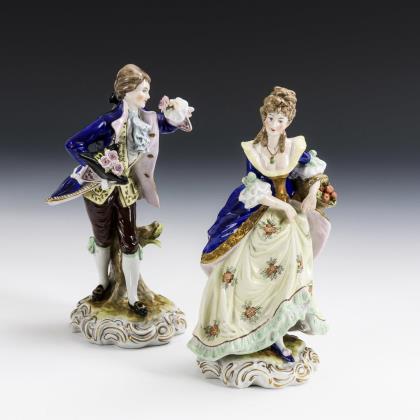 Je auf einem Rocaillesockel stehende Dame mit Blumenkorb und Kavalier mit Rosen