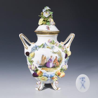 Beidseits plastisch aufgelegte Blüten und Früchte. Auf dem Deckel plastisches Blumenbukett. Farbig bemalt, gold staffiert. Frontal Rokoko-Paar in Landschaft. Auf dem Deckel rückseitig und seitlich Blüten und Insekten. Bodenmarke