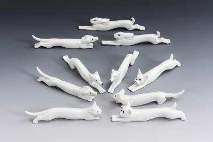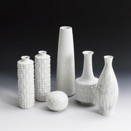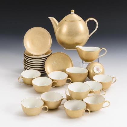 Form "Wellenspiel-Relief". Entwurf von Sabine Wachs (*1960) und Jörg Danielczyk (*1952 in Altzschillen). Kaffeekanne (H 30,5 cm), 8 Teetassen, 8 Untertassen, 5 Frühstücksteller, 8 Eierbecher (H 7 cm), 1 Butterdose und 1 Tortenplatte (Ø 38 cm)