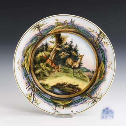 Teller mit der Darstellung eines Waldstückes mit Fuchs, Ricke und Kitz im Spiegel sowie Landschaftsmalerei mit Wildtieren auf der Fahne