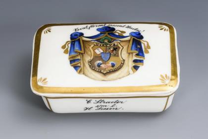 Rechteckige Dose mit Reibefläche im Deckelinneren. Auf dem Deckel ein studentisches Wappen (Unitas Salia/Bonn?) mit der Umschrift "Vivat floreat crescat Unitas!", auf dem Korpus die Widmung " C. Straeter s/m l. H. Liesen. / Münster 20/6 1863"
