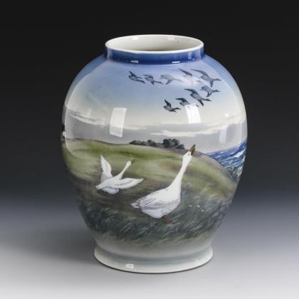 Balustervase mit der umlaufenden Darstellung einer Küstenlandschaft mit Gänsen und Wildgänsen