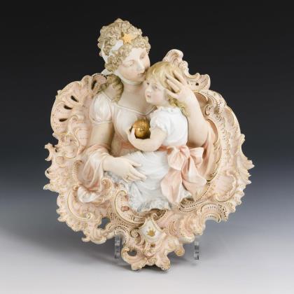 Teils durchbrochenes Rocailleschild mit der halbplastischen Darstellung der Königin Luise, eines ihrer Kinder auf dem Arm haltend