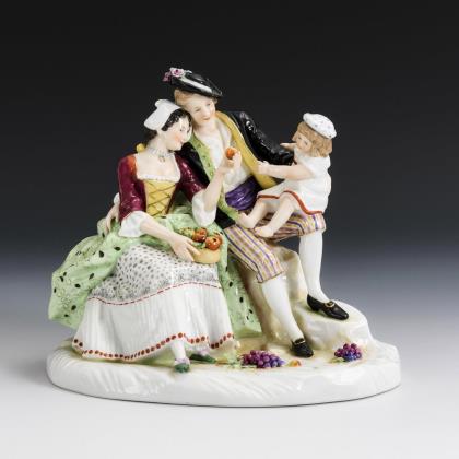 Auf einem Felssockel sitzendes Gärtnerpaar mit Kind, mit einem Korb Äpfeln und Trauben