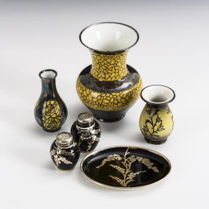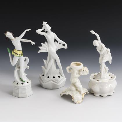 2 Durchbruchschalen mit vier Füßen (Ø 16,5 cm), 2 Blumenübertöpfe mit Rocaillerelief (H 10 und 11,5 cm) sowie 1 Deckelvase mit Widderkopfhandhaben (H 22 cm)