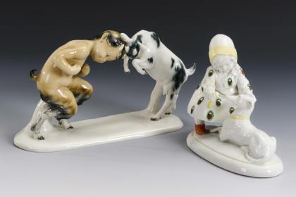 1x gemarkt Katzhütte: Art-déco-Plastik eines vor einem Windhund stehenden Mädchens (H 12 cm). / 1x gemarkt Goebel, bezeichnet "Gustafsson": Plastik eines sich mit einem Ziegenböckchen die Hörner stoßenden Fauns (H 11 cm)