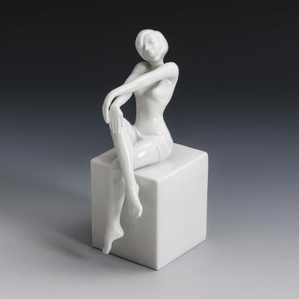 Aus der Serie "Eros". Auf einem Quader sitzende, leicht bekleidete junge Dame