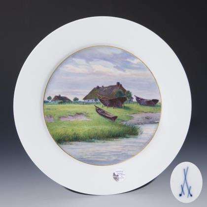Farbig bemalt, gold staffiert. "Norddeutsche Landschaft mit Booten". Pressmarken, Schwertermarke, Sammlungs-Etikett
