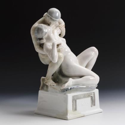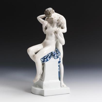 Aktdarstellung einer auf einem Postament sitzenden Frau, den hinter ihr stehenden Mann küssend