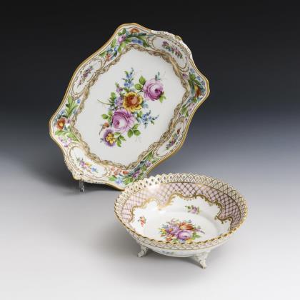 Durchbruchschale auf drei Füßen (Ø 19 cm), Durchbruchkorb mit zwei Asthenkeln und Blütenbelag (H 7 cm) und Cachepot mit Blütenbelag (H 10 cm)