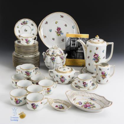 43 + 1 Teile. Kaffeekanne (H 23,5 cm), Milchkännchen, Zuckerdose, Bonboniere, 12 Tassen, 11 Untertassen, 12 Kuchenteller, 2 Durchbruchschalen (L 12,5 und 23,5 cm), 1 Kredenzteller (Ø 28 cm) und 1 Untersetzer (Ø 17 cm). Als Zugabe das Buch: Sonntag, Hans, Helena Wolfsohn & Co. Chronik einer jüdischen Händlerfamilie in Dresden, Dresden 2016, 163 Seiten, einige Abbildungen