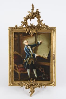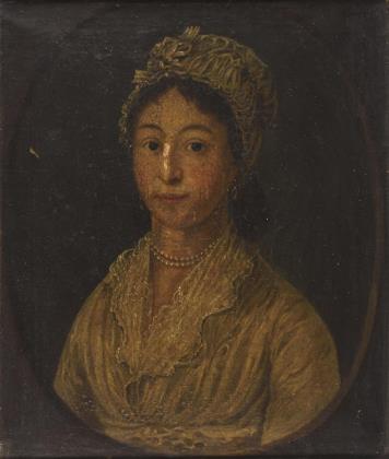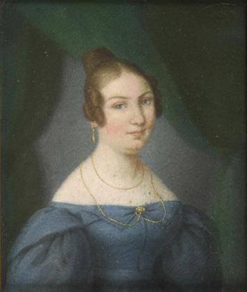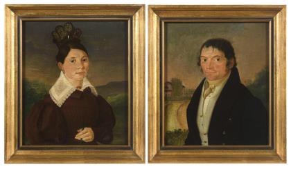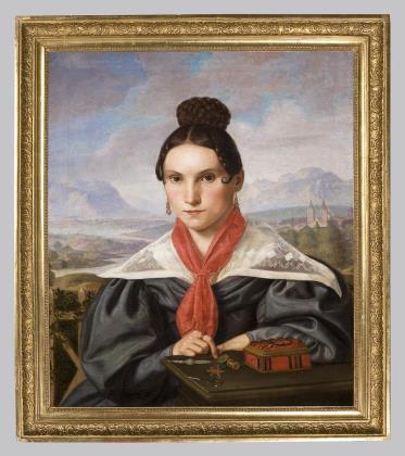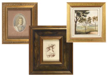 Ein Frauenbildnis, ein Kinderbildnis mit Allongeperücke sowie eine Landschaftsbild mit Landhaus
