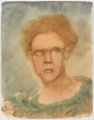 Schemenhaftes Bildnis eines Mannes vor blauem Hintergrund