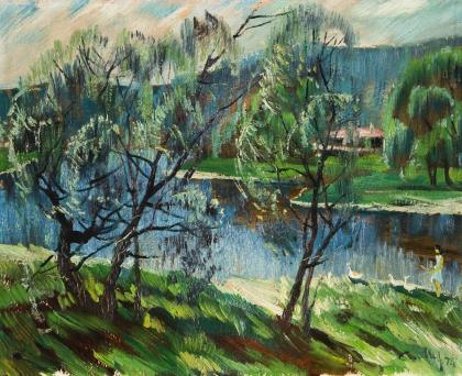 RUSSIAN PAINTER 20TH CENTURY. River landscape with staffage.