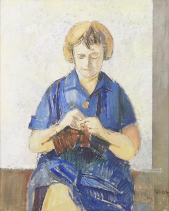 Bildnis einer Frau in blauem Kleid beim Stricken