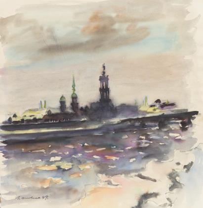 Blick vom Fluss zur schemenhaft erkennbaren Stadt vor dem Abendhimmel