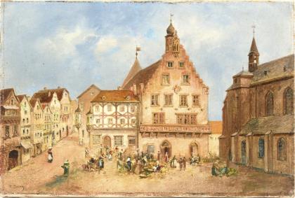 Wohl fränkische Stadtansicht mit regem Treiben an den Marktständen bei hellem Licht