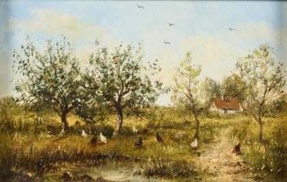 Hühnerschar unter blühenden Obstbäumen nahe dem Bauernhaus