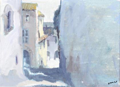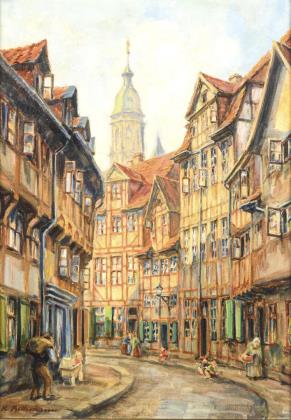 Staffagefiguren in der engen Gasse zwischen den Häusern und Schatten spendenden Bäumen