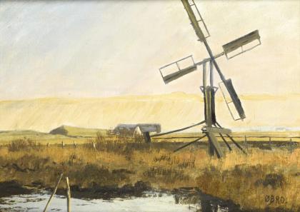ØBRO, Aage (1884 Raagelund - 1978 Soro). Landscape with windmill.