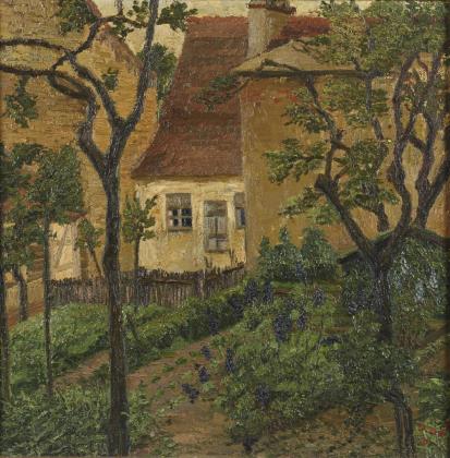 Pastos gemalter Garten mit blühenden Blumen vor den Häusern