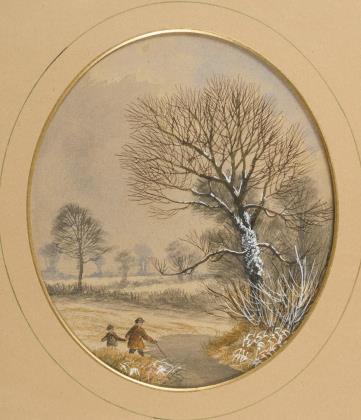 Staffagefiguren an einem gefrorenen Bach in weiter, verschneiter Landschaft