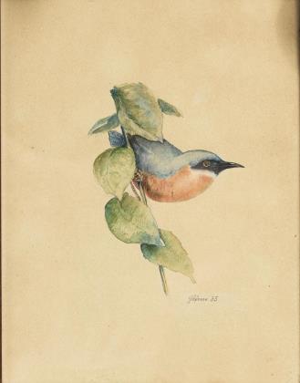 Kleine Studie des Vogels auf einem Zweig zwischen Blättern