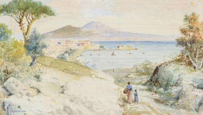 Staffagefiguren auf einem Weg in Richtung der süditalienischen Stadt mit dem Vesuv am Horizont