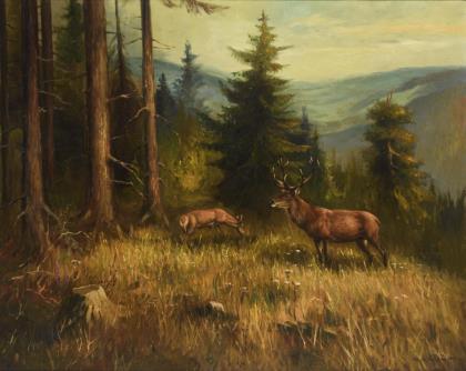 KÖNIG, Gerald (also Günther Kessler, 1926 Gießen - 2006). Red Deer at the Edge of the Forest.