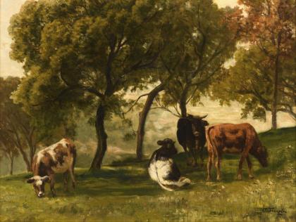 FRENZEL, Oskar (1855 Berlin - 1915 Berlin). Cows at the edge of the forest.