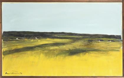 Je weite norddeutsche Landschaft mit Häusern auf Hügeln unter bedecktem Himmel