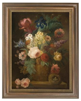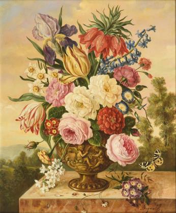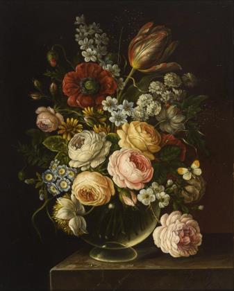 Altmeisterlich gemaltes Blumenbukett mit Tulpen und Rosen auf einem Sims unter Abendhimmel