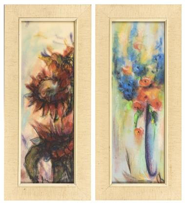 Expressive Darstellungen von Sonnenblumen und einem Strauß in schlanker Vase