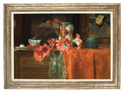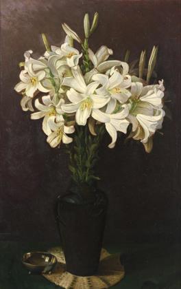 Weiße Lilien in schlanker Vase mit Frosch und Eidechse neben einer silbernen Schale